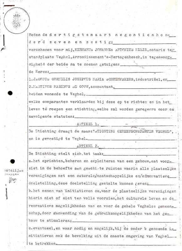 De geschiedenis van ons theater begint in de jaren 60, toen er in Veghel een grote behoefte was aan een centrale plek waar verenigingen, organisaties en inwoners samen konden komen. De eerste ideeën voor een cultureel centrum dateren al uit 1960, maar financiële uitdagingen hielden het plan tegen. In 1967 kwam er schot in de zaak: op 30 maart 1967 werd de oprichtingsakte van Stichting Gemeenschapshuis Veghel ondertekend. Architect Ton Beunis maakte het ontwerp en dankzij bijdragen van gemeente, provincie, Rijk en particulieren kon de bouw starten. Op 1 mei 1968 legde toenmalig burgemeester J.P. Schreven de eerste steen van De Blauwe Kei.