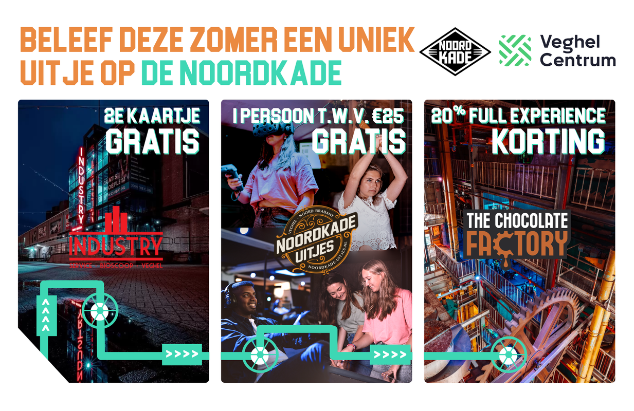 Extra leuk: doe je aankopen in Veghel Centrum of op de Noordkade? Dan ontvang je een waardebon voor korting op jouw uitje bij Noordkade Uitjes, The Chocolate Factory of Industry Bioscoop.